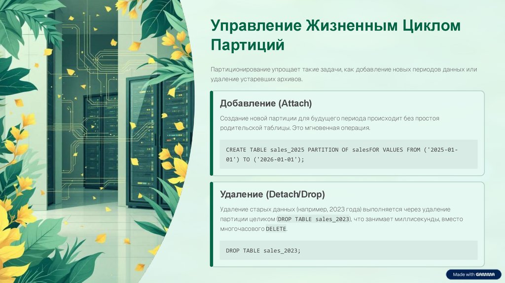 партиции целиком (DROP TABLE sales_2023), что занимает миллисекунды, вместо