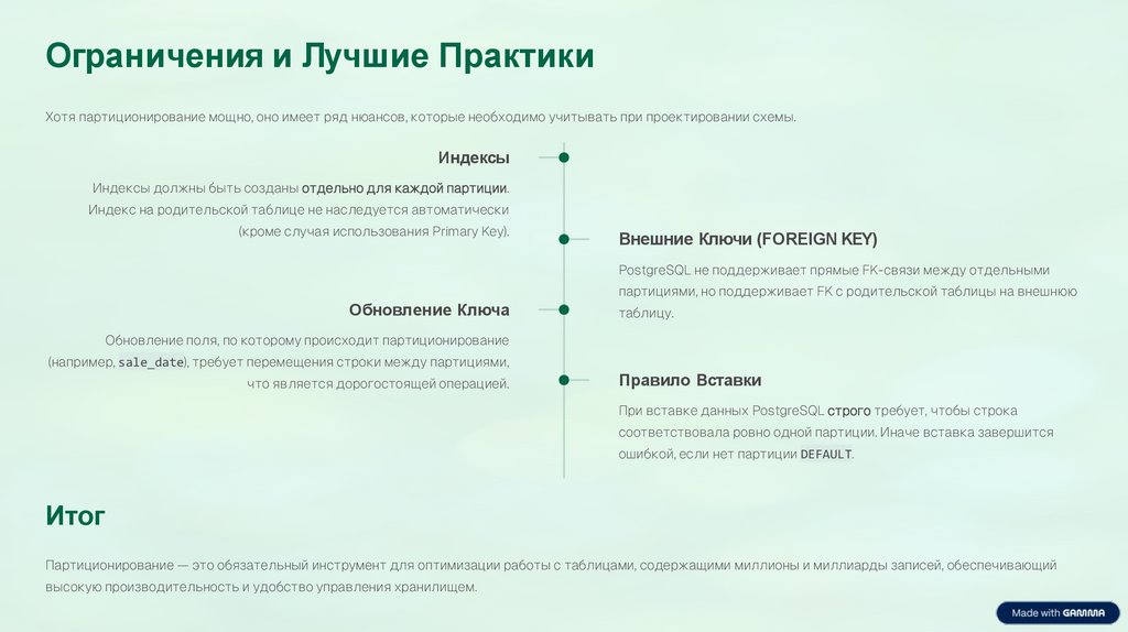 Ограничения и Лучшие ПрактикиХотя партиционирование мощно, оно имеет ряд нюансов, которые необходимо учитывать при проектировании схемы.
