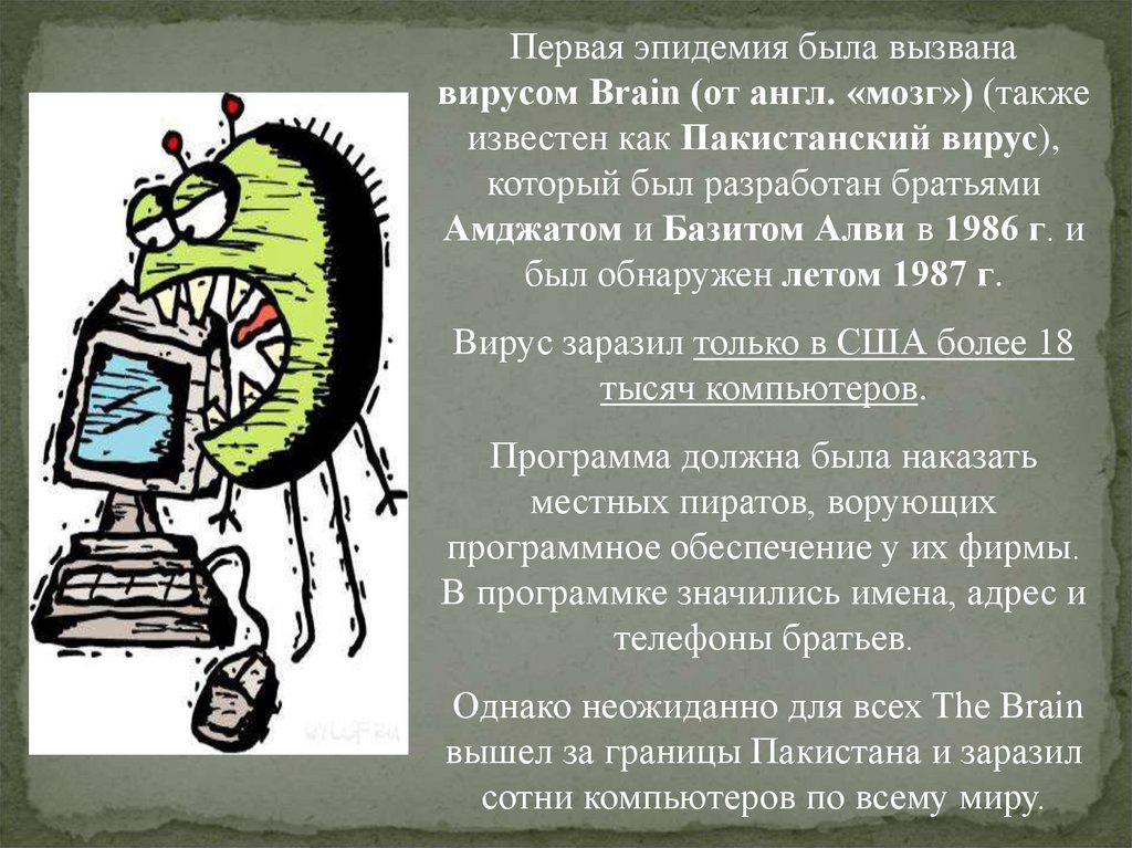 Первая эпидемия была вызванавирусом Brain (от англ. «мозг») (также