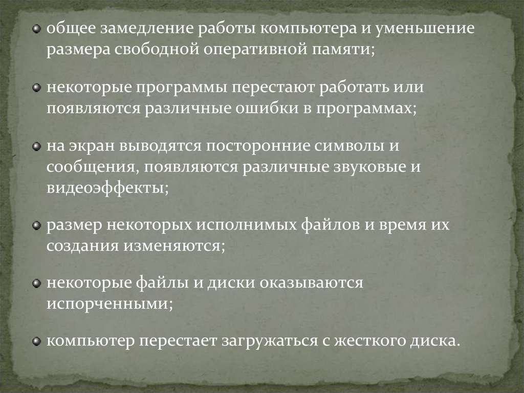 общее замедление работы компьютера и уменьшениеразмера свободной оперативной памяти;