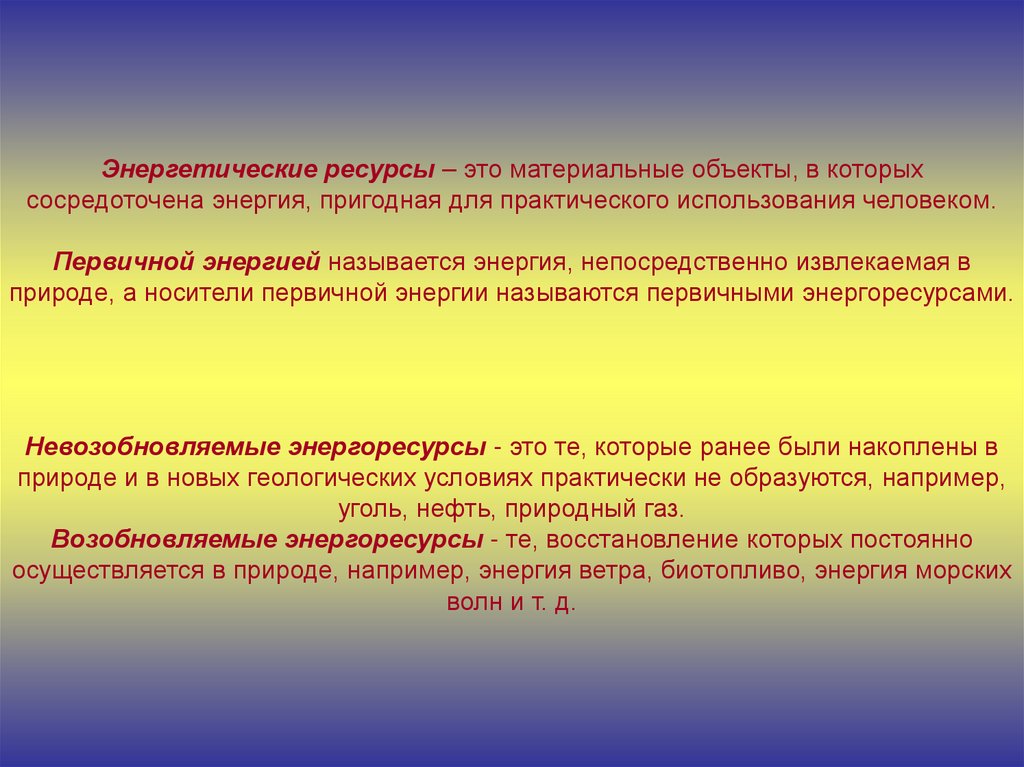 Энергетические ресурсы – это материальные объекты, в которыхсосредоточена энергия, пригодная для практического использования человеком.