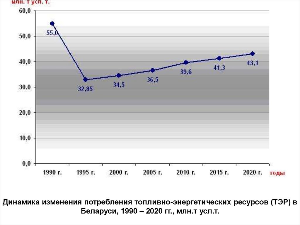 Динамика изменения потребления топливно-энергетических ресурсов (ТЭР) вБеларуси, 1990 – 2020 гг., млн.т усл.т.