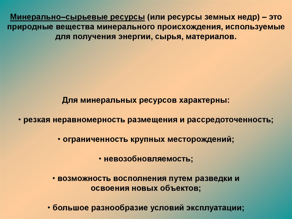 Минерально–сырьевые ресурсы (или ресурсы земных недр) – этоприродные вещества минерального происхождения, используемые