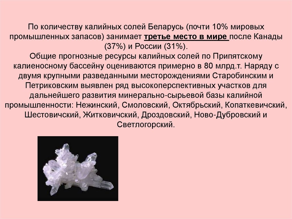 По количеству калийных солей Беларусь (почти 10% мировыхпромышленных запасов) занимает третье место в мире после Канады