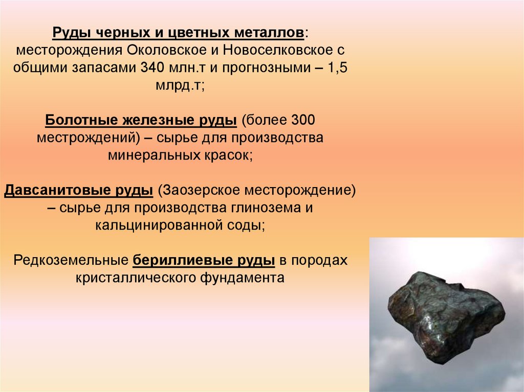 – горно–химического сырья (фосфориты,апатиты, соли,сера);