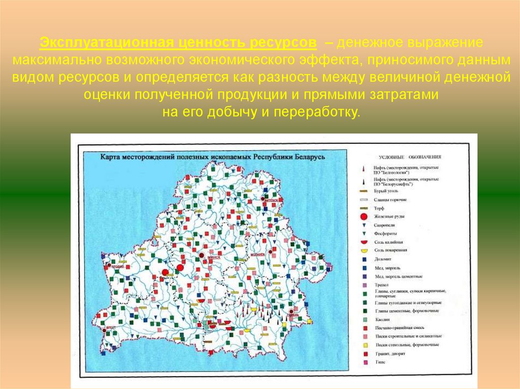 Эксплуатационная ценность ресурсов – денежное выражениемаксимально возможного экономического эффекта, приносимого данным