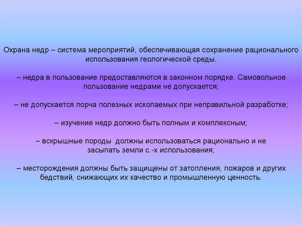 Охрана недр – система мероприятий, обеспечивающая сохранение рациональногоиспользования геологической среды.