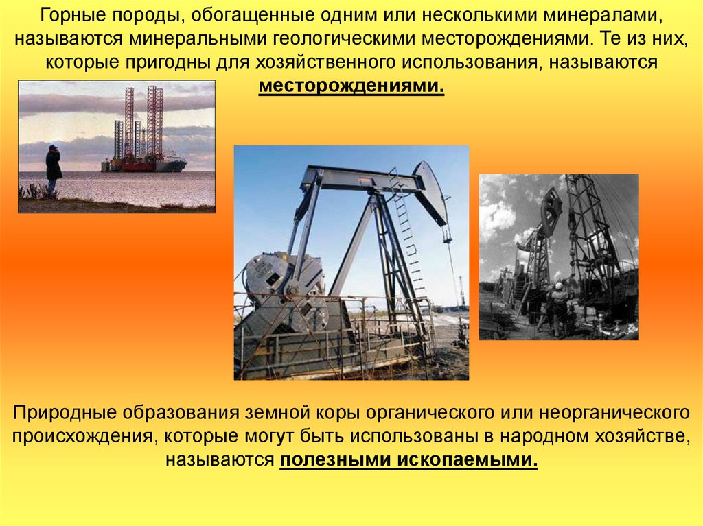 Горные породы, обогащенные одним или несколькими минералами,называются минеральными геологическими месторождениями. Те из них,