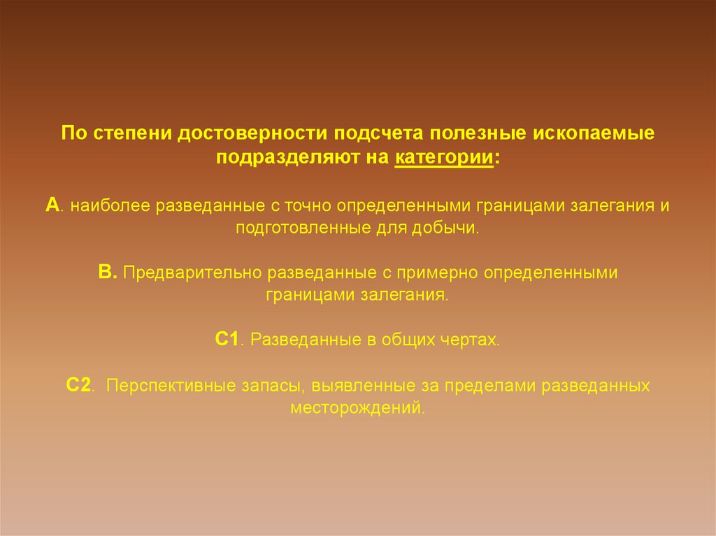 По степени достоверности подсчета полезные ископаемыеподразделяют на категории: