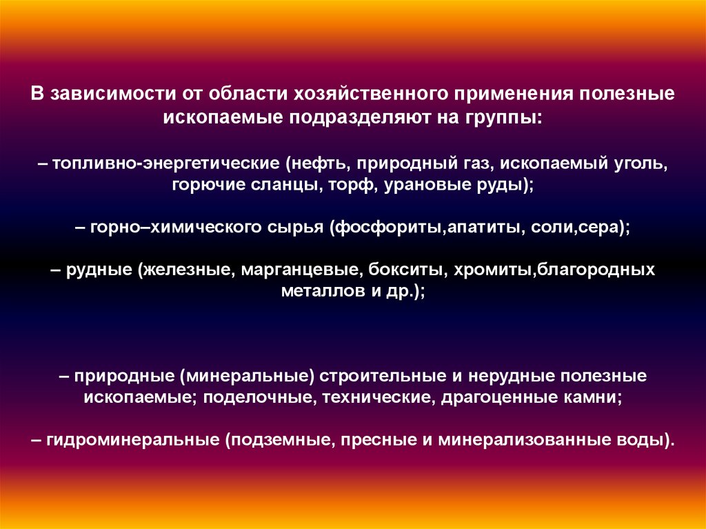 В зависимости от области хозяйственного применения полезныеископаемые подразделяют на группы: