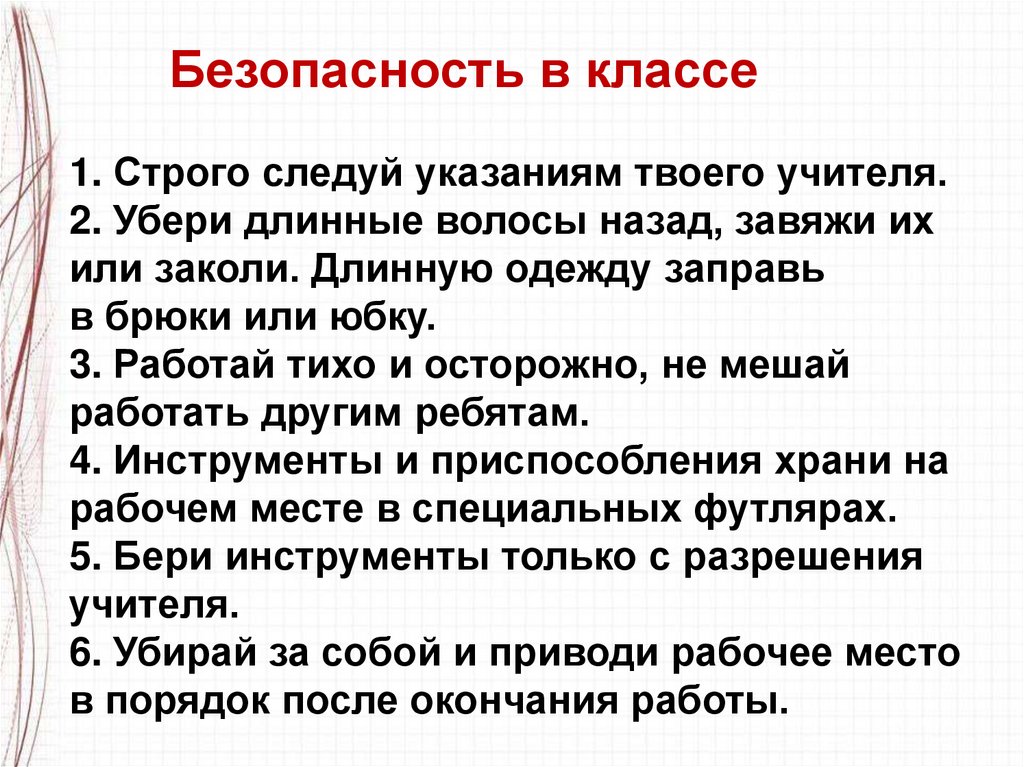 Безопасность в классе1. Строго следуй указаниям твоего учителя.