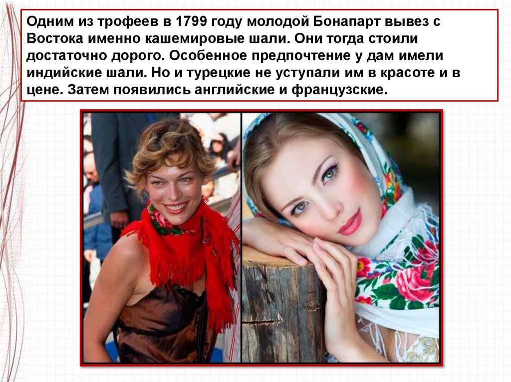 Одним из трофеев в 1799 году молодой Бонапарт вывез сВостока именно кашемировые шали. Они тогда стоили