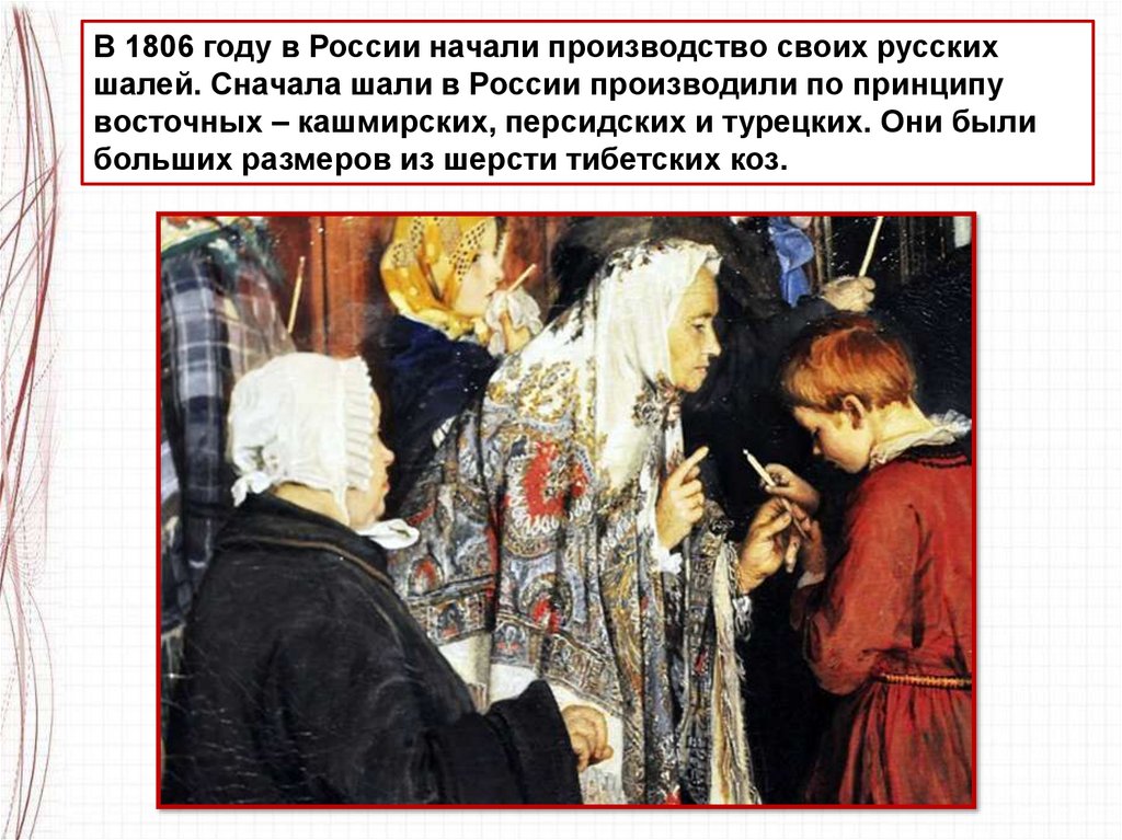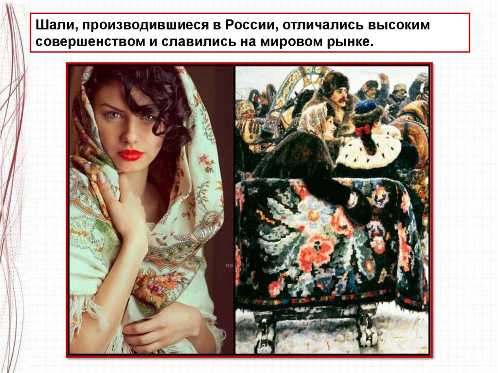 Шали, производившиеся в России, отличались высокимсовершенством и славились на мировом рынке.