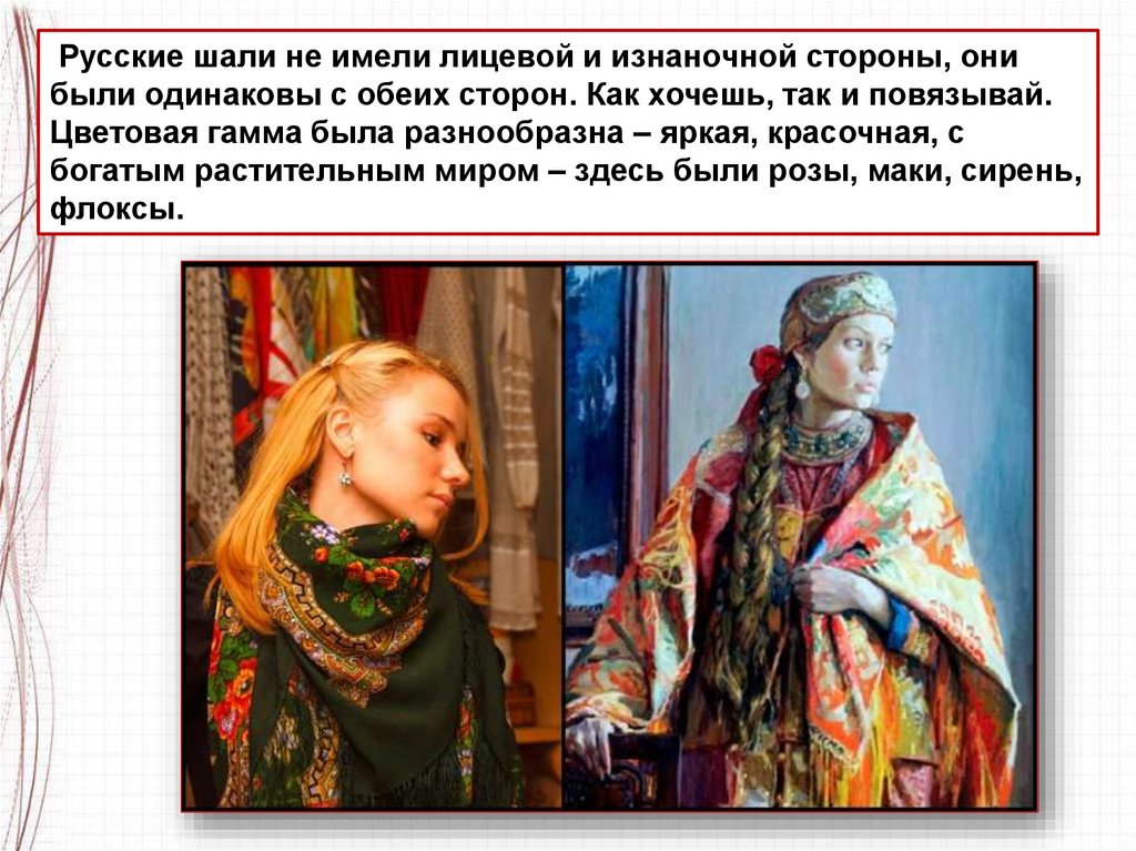Русские шали не имели лицевой и изнаночной стороны, онибыли одинаковы с обеих сторон. Как хочешь, так и повязывай.