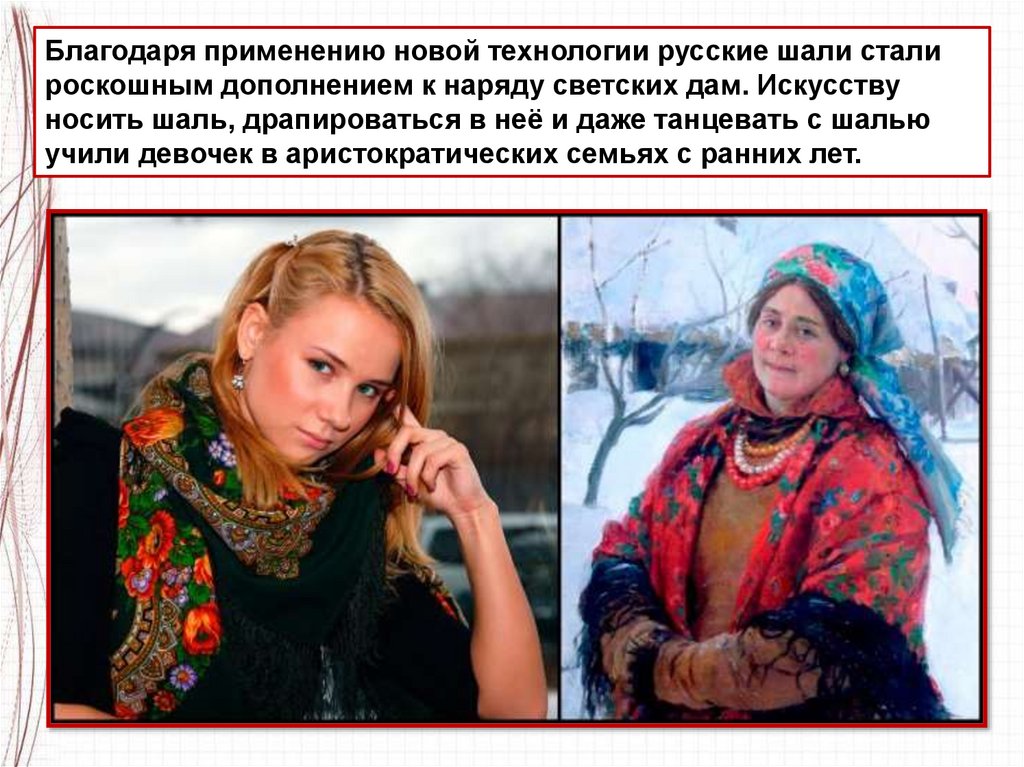 Благодаря применению новой технологии русские шали сталироскошным дополнением к наряду светских дам. Искусству