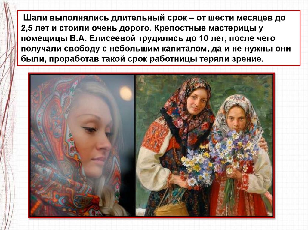 Шали выполнялись длительный срок – от шести месяцев до2,5 лет и стоили очень дорого. Крепостные мастерицы у