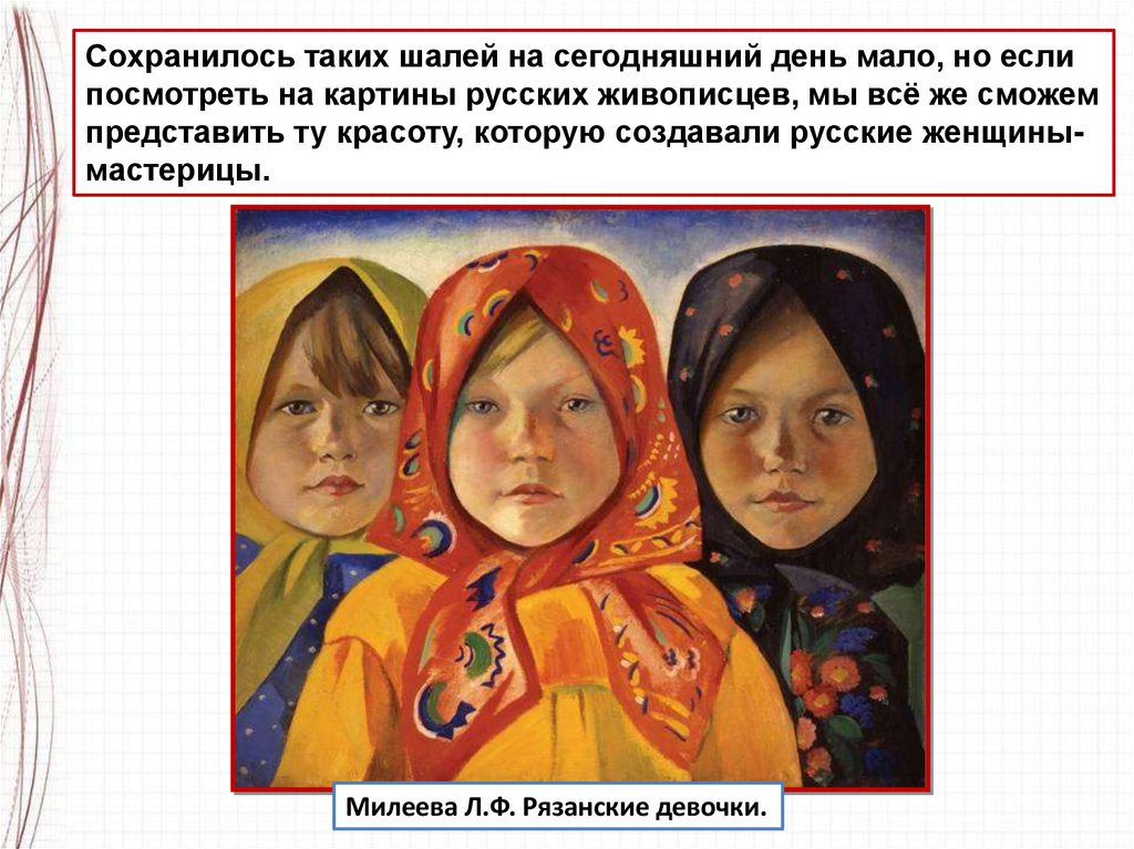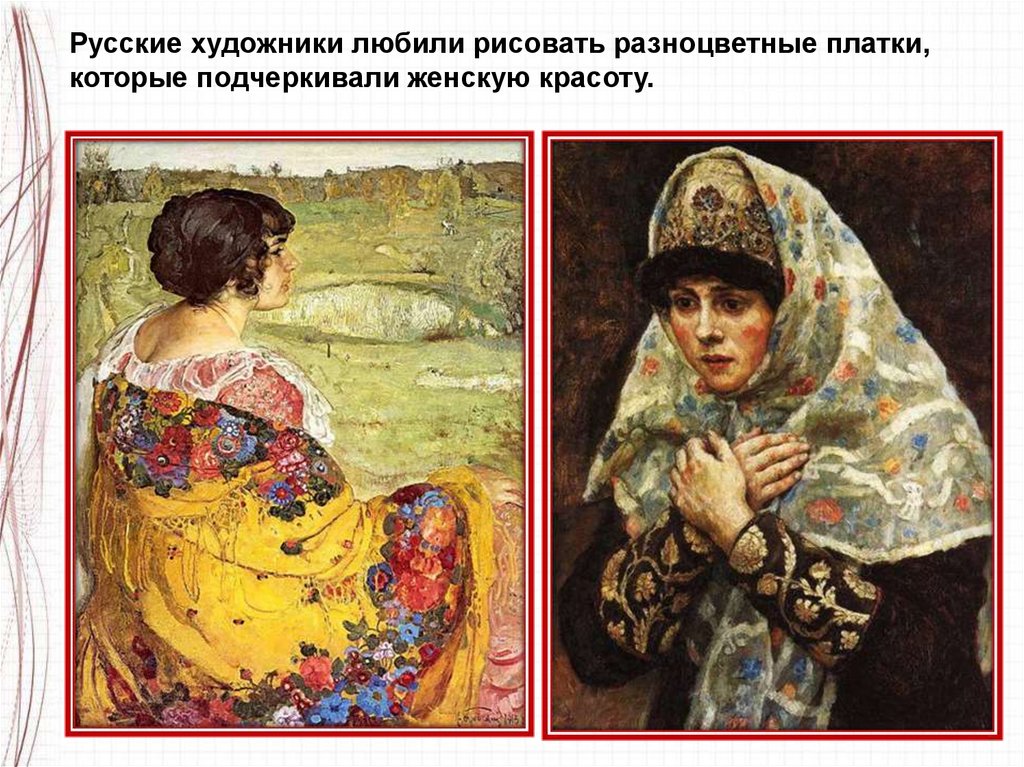 Русские художники любили рисовать разноцветные платки,которые подчеркивали женскую красоту.