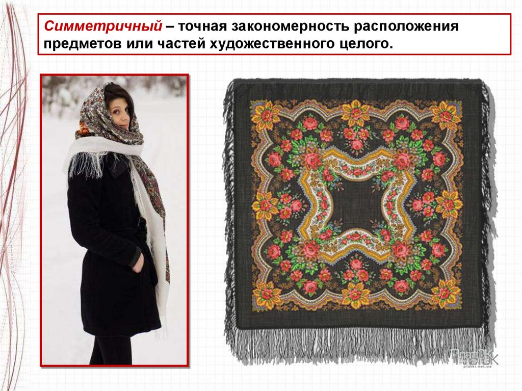 Симметричный – точная закономерность расположенияпредметов или частей художественного целого.