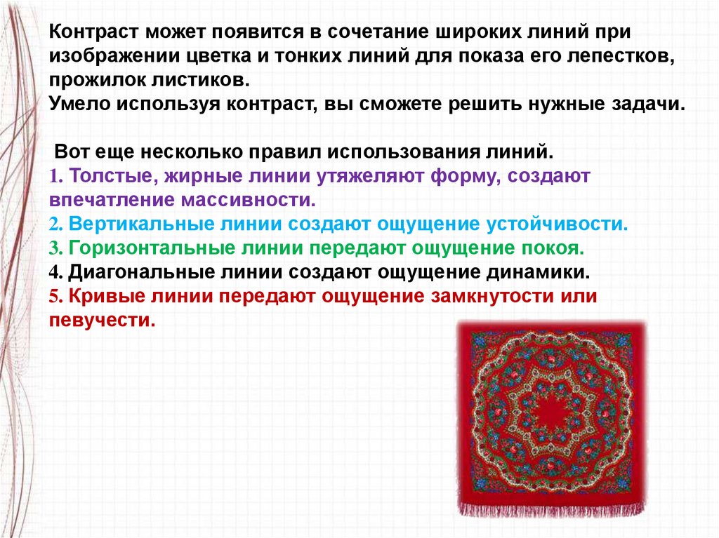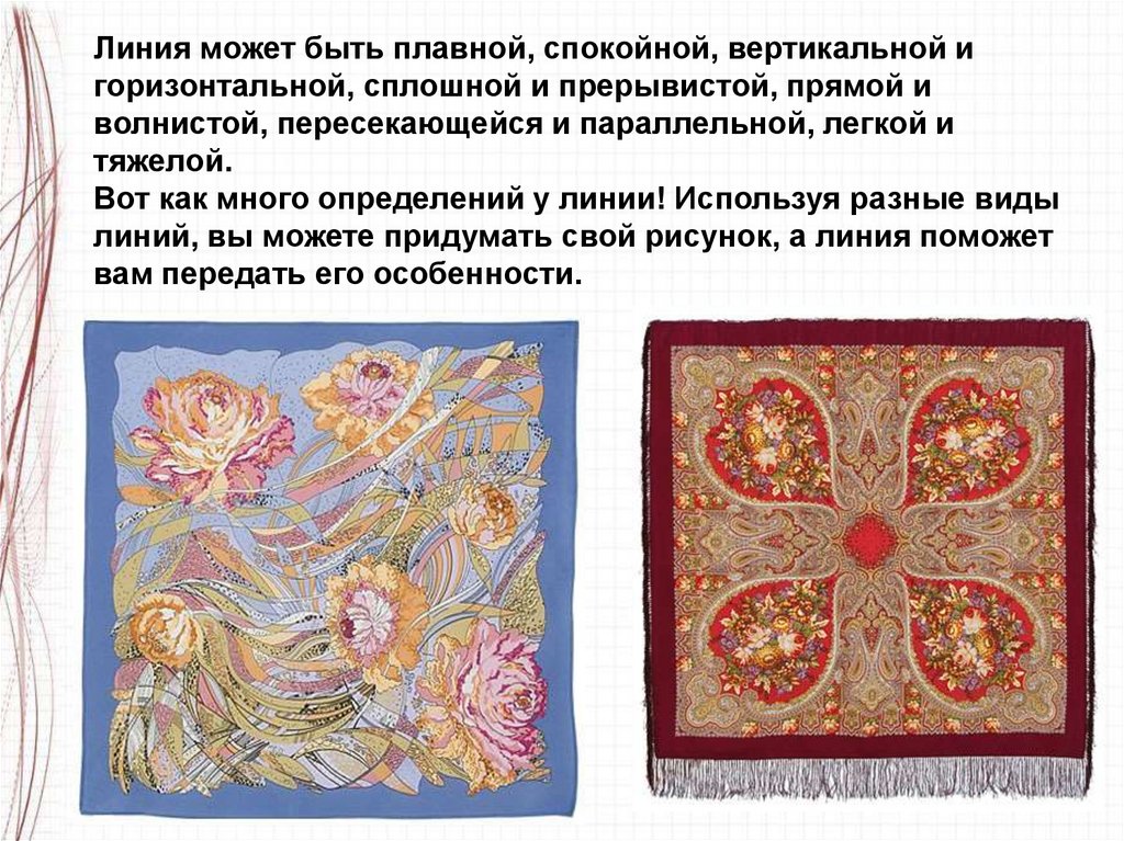 Линия может быть плавной, спокойной, вертикальной игоризонтальной, сплошной и прерывистой, прямой и