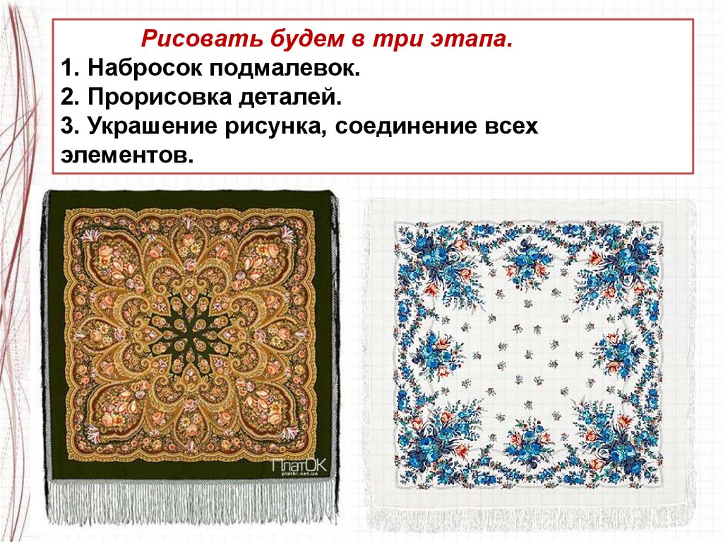 Платок – это украшение, которое создают люди, нодля начала они придумывают, какой рисунок будет у