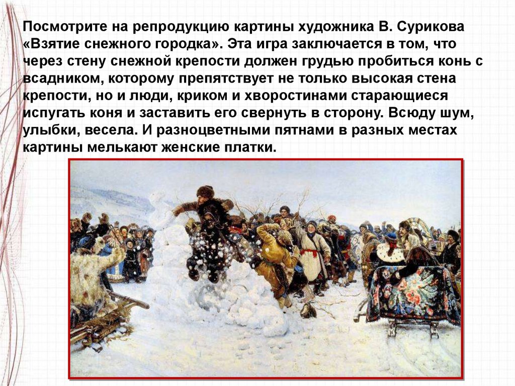 Посмотрите на репродукцию картины художника В. Сурикова«Взятие снежного городка». Эта игра заключается в том, что
