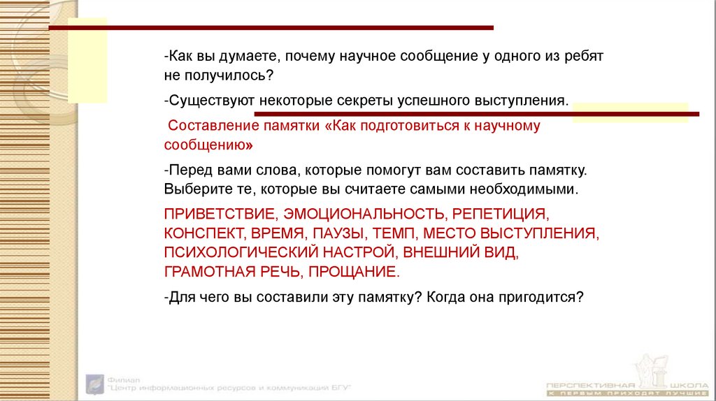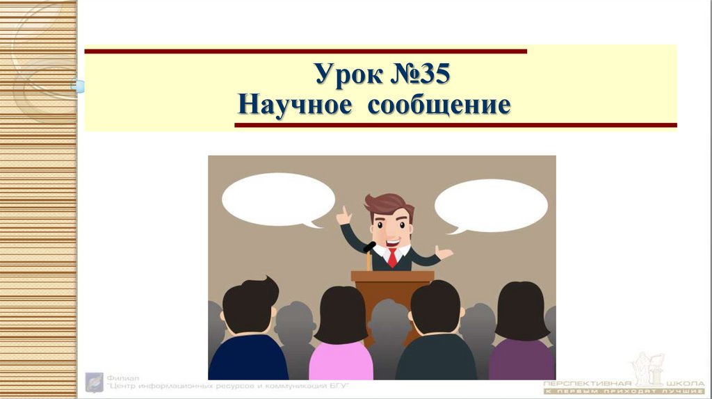Научное сообщение – небольшое выступление внаучном стиле по предложенной заранее теме.