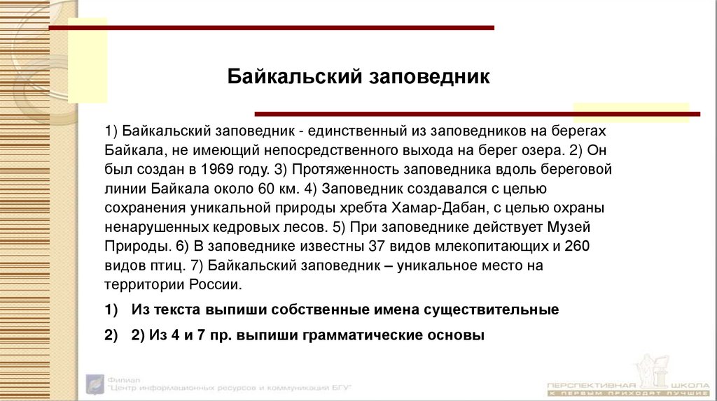 Байкальский заповедник1) Байкальский заповедник - единственный из заповедников на берегах