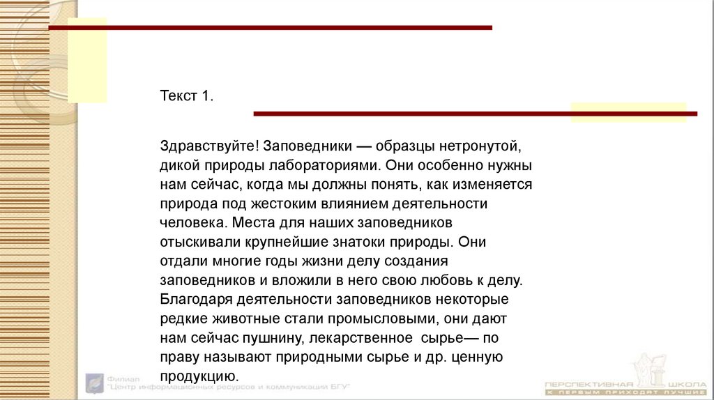 Текст 1.Здравствуйте! Заповедники — образцы нетронутой,