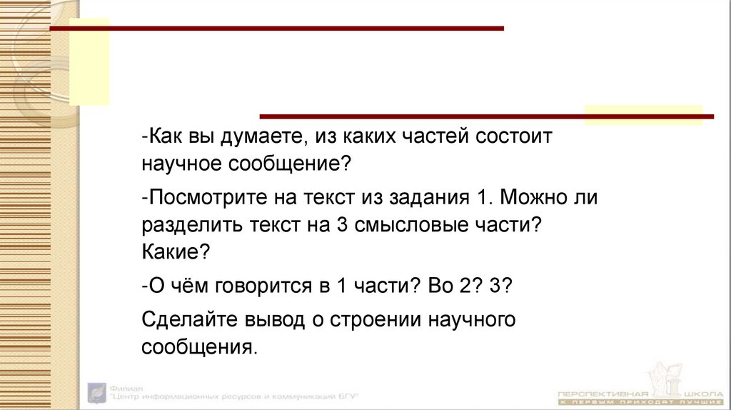 -Как вы думаете, из каких частей состоитнаучное сообщение?