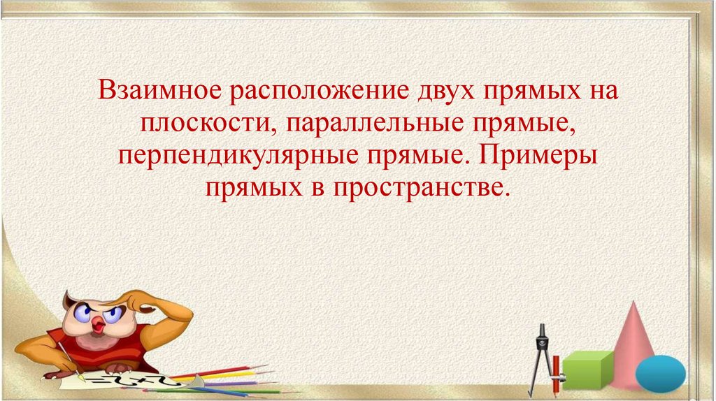 1. Взаимное расположение двух прямых на плоскости, параллельные прямые, перпендикулярные прямые. Примеры прямых в пространстве.