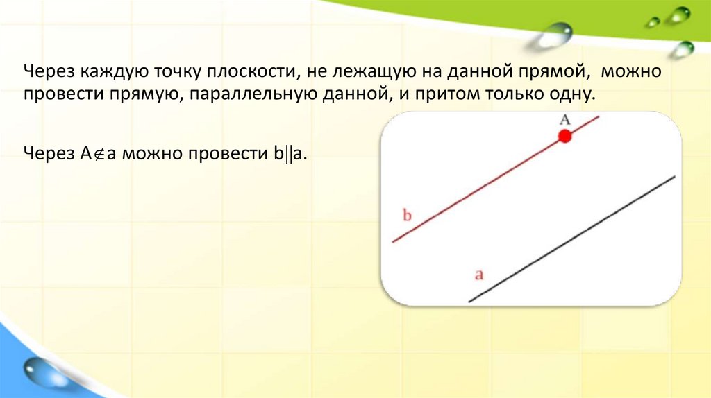 Через каждую точку плоскости, не лежащую на данной прямой, можнопровести прямую, параллельную данной, и притом только одну.