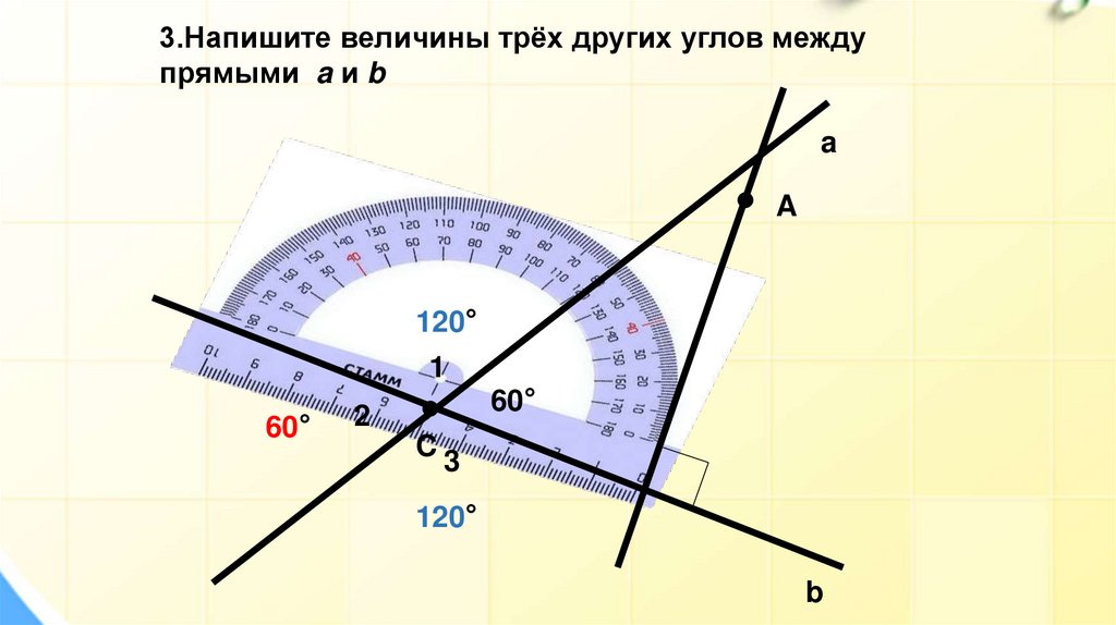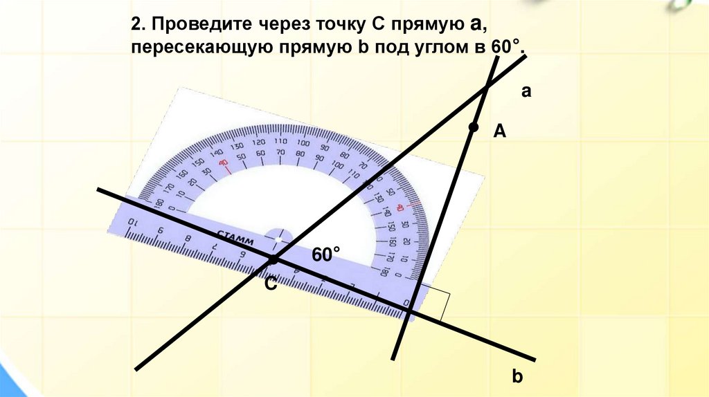 2. Проведите через точку С прямую a,пересекающую прямую b под углом в 60°.