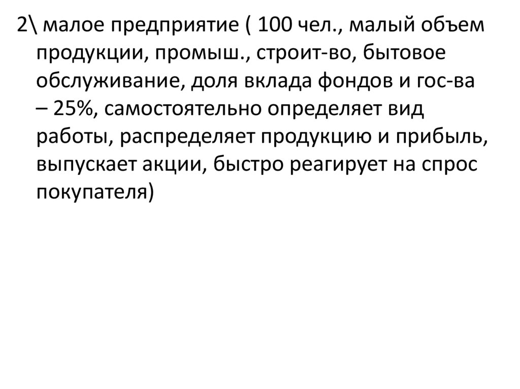 2\ малое предприятие ( 100 чел., малый объемпродукции, промыш., строит-во, бытовое