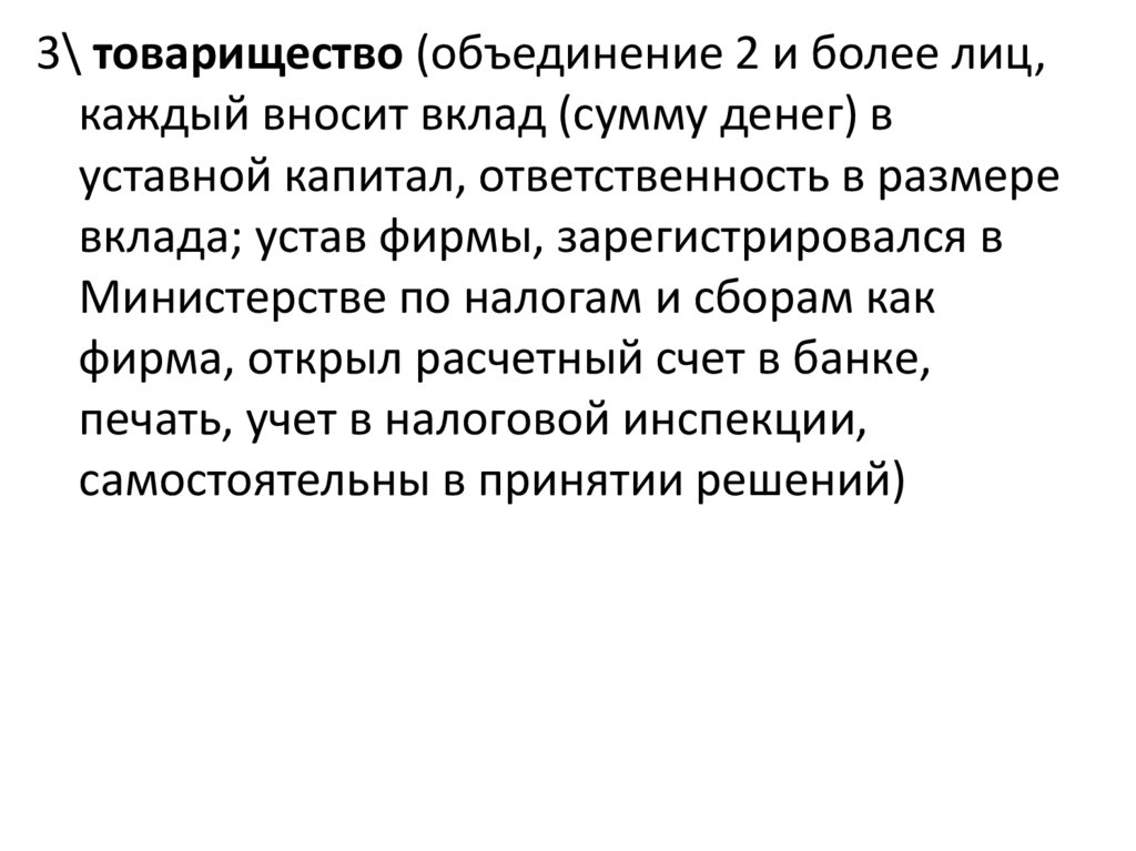 3\ товарищество (объединение 2 и более лиц,каждый вносит вклад (сумму денег) в