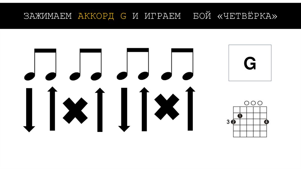 ЗАЖИМАЕМ АККОРД G И ИГРАЕМБОЙ «ЧЕТВЁРКА»