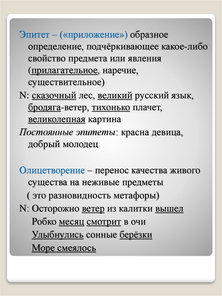 Эпитет – («приложение») образноеопределение, подчёркивающее какое-либо
