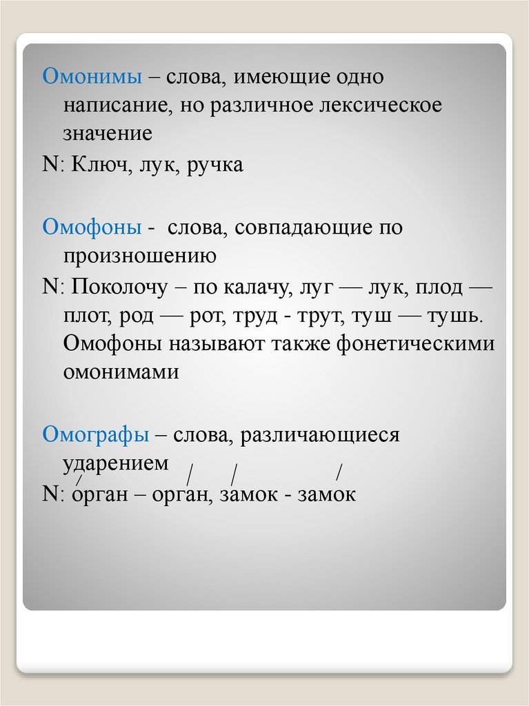 Омонимы – слова, имеющие однонаписание, но различное лексическое