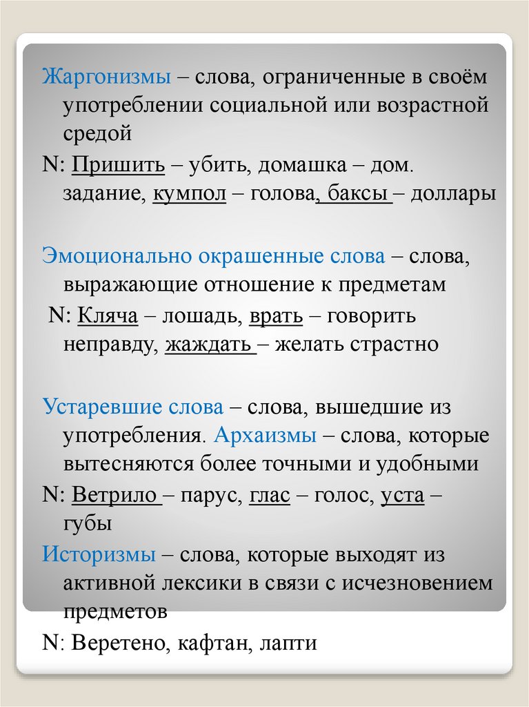 Жаргонизмы – слова, ограниченные в своёмупотреблении социальной или возрастной