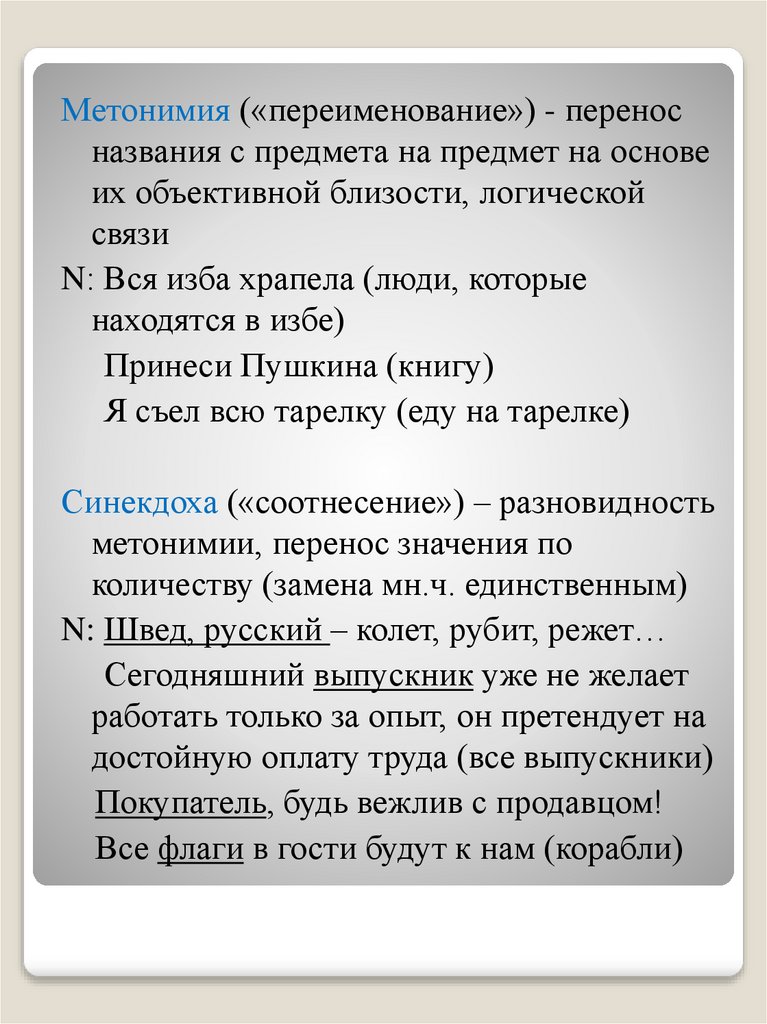 Метонимия («переименование») - переносназвания с предмета на предмет на основе
