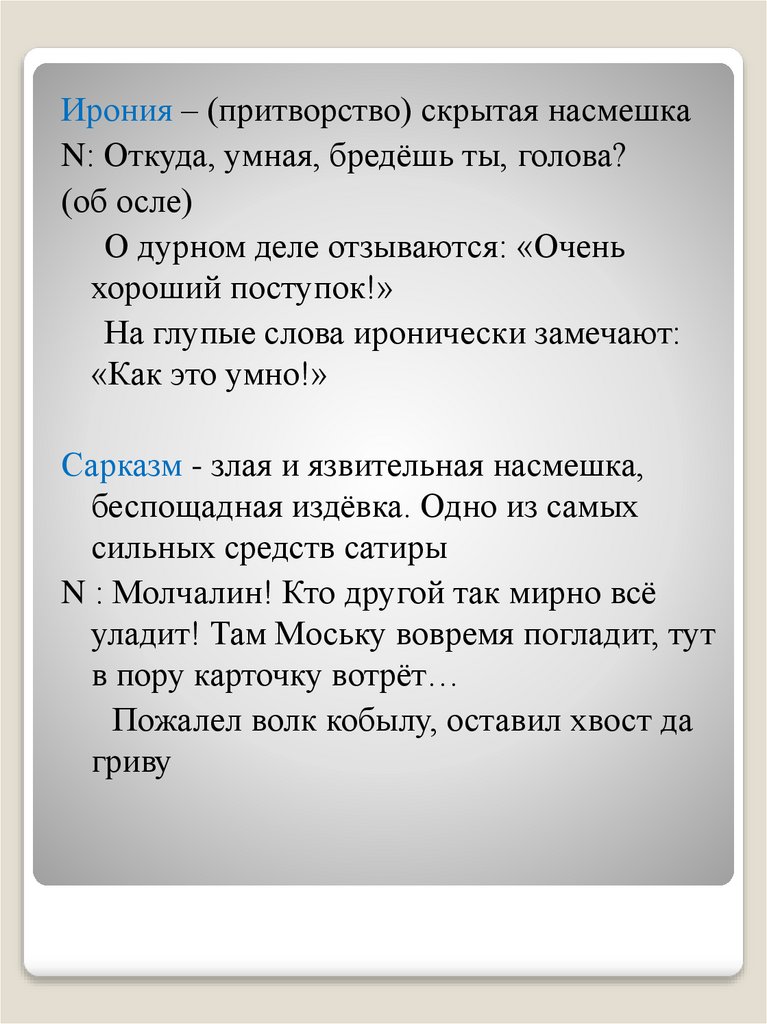 Ирония – (притворство) скрытая насмешкаN: Откуда, умная, бредёшь ты, голова?