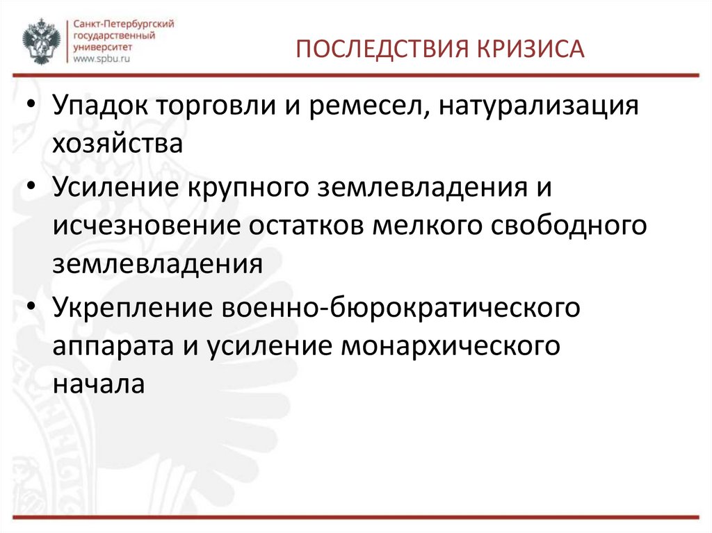 ПОСЛЕДСТВИЯ КРИЗИСА• Упадок торговли и ремесел, натурализация