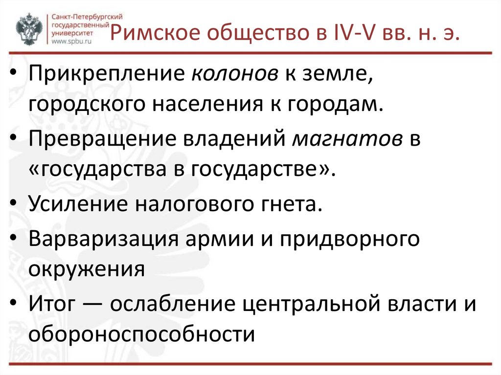 Римское общество в IV-V вв. н. э.• Прикрепление колонов к земле,