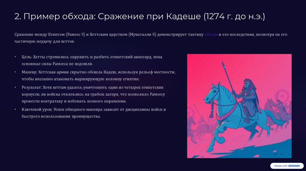 2. Пример обхода: Сражение при Кадеше (1274 г. до н.э.)Сражение между Египтом (Рамзес II) и Хеттским царством (Муваталли II) демонстрирует тактику обхода и его последствия, несмотря на его
