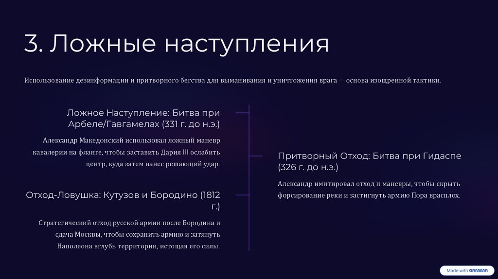 3. Ложные наступленияИспользование дезинформации и притворного бегства для выманивания и уничтожения врага — основа изощренной тактики.