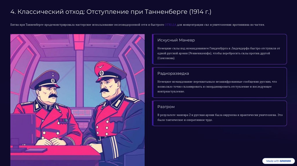 4. Классический отход: Отступление при Танненберге (1914 г.)Битва при Танненберге продемонстрировала мастерское использование железнодорожной сети и быстрого ОТХОДА для концентрации сил и уничтожения противника по частям.