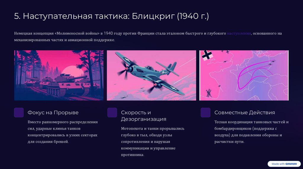 5. Наступательная тактика: Блицкриг (1940 г.)Немецкая концепция «Молниеносной войны» в 1940 году против Франции стала эталоном быстрого и глубокого наступления, основанного на