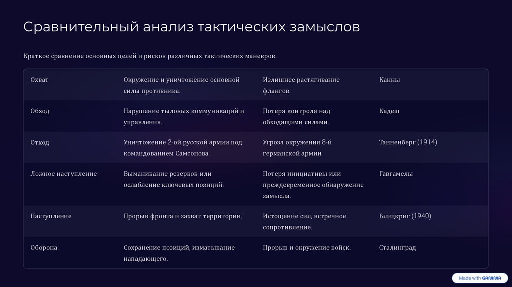 Сравнительный анализ тактических замысловКраткое сравнение основных целей и рисков различных тактических маневров.