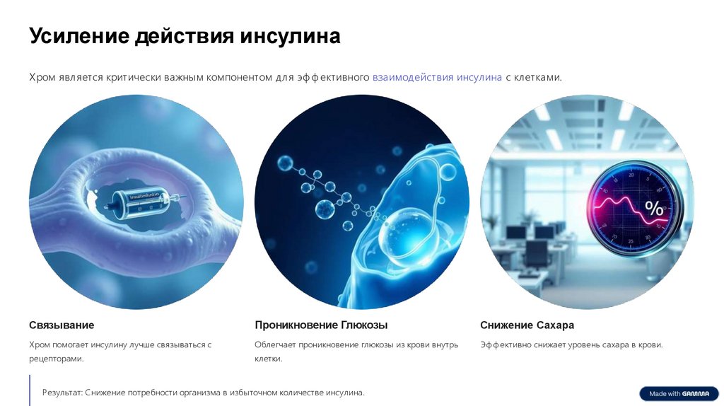 Усиление действия инсулинаХром является критически важным компонентом для эф ф ективного взаимодействия инсулина с клетками.