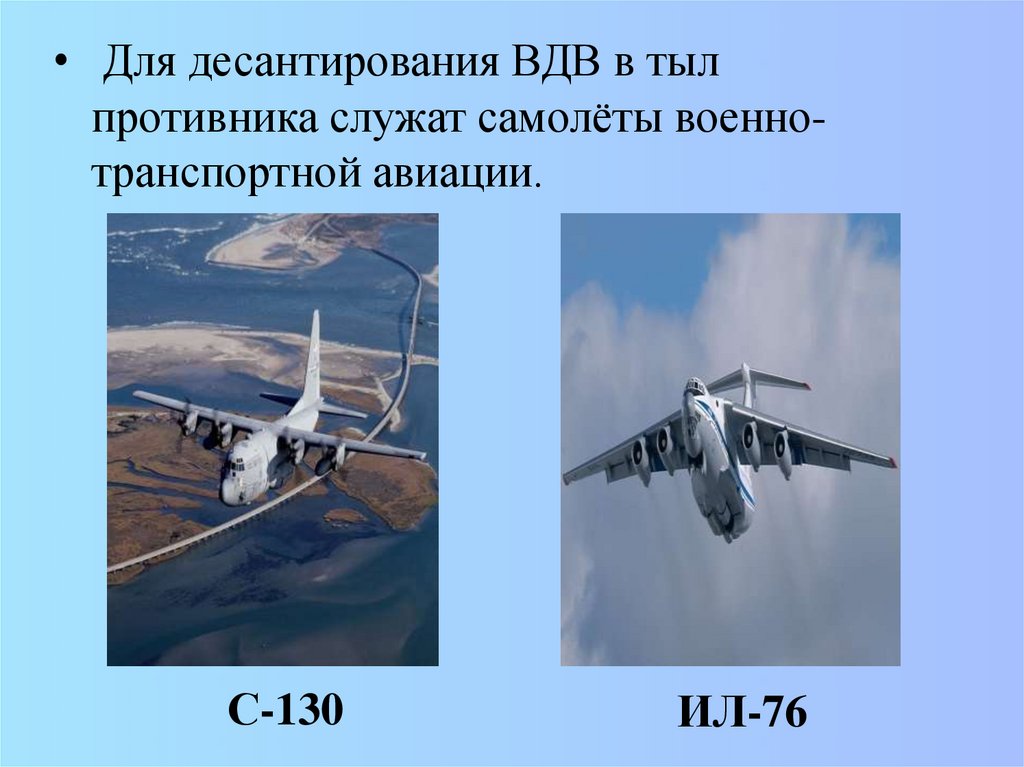 • Для десантирования ВДВ в тылпротивника служат самолёты военнотранспортной авиации.