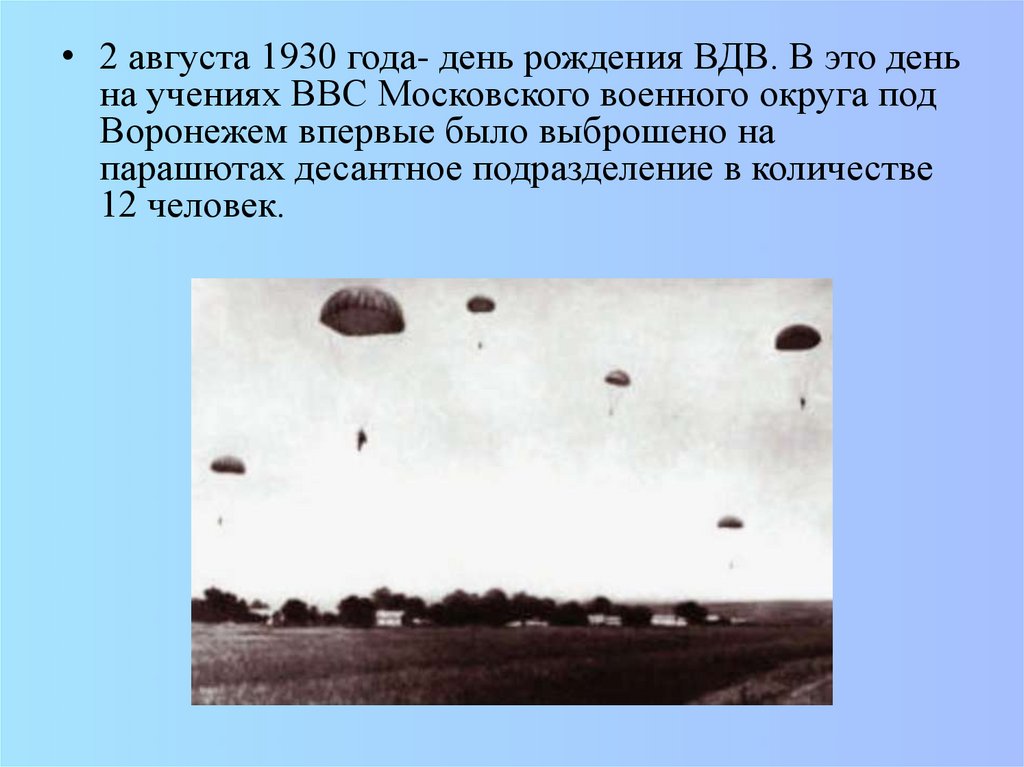 • 2 августа 1930 года- день рождения ВДВ. В это деньна учениях ВВС Московского военного округа под
